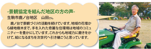 | 奈良県では、地域の皆さんによる景観づくりのための自主的なルールづくりを支援しています。 地域の景観を見つめ直し、緑化や美化などの景観づくりに関するルールを決めて、地域の皆さんで協定を結んでみませんか? 自治会などの地域住民の方々が主体となり、地域の良好な景観を守り、育て、創り出していただくため、「奈良県景観住民協定」づくりに取り組み、わがまちの景観を地域共有の貴重な資産として次世代に引き継いでいきましょう。 |