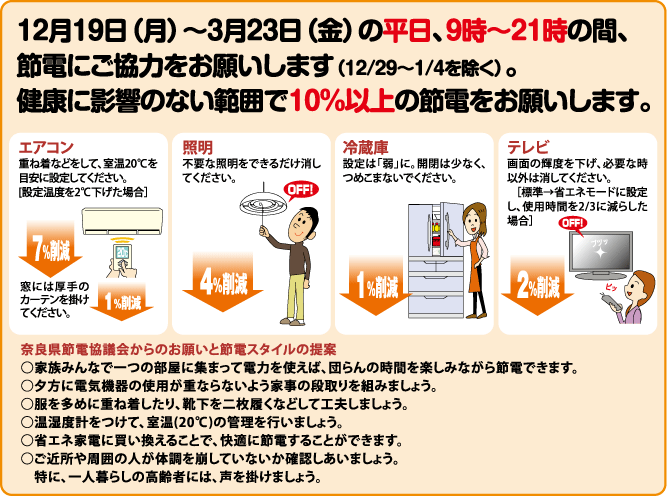 ![]() 奈良県では、今夏、大規模停電を防ぐため、奈良県節電協議会を立ち上げ節電対策に取り組んで参りました。皆さんのご協力により、関西で一番の節電効果をあげることができました。ご協力ありがとうございました。 今冬においても、電力の需給状況は厳しく、再度、節電のお願いをせざるを得ない状況です。皆さんのご理解とご協力をお願いします。 ![]() |