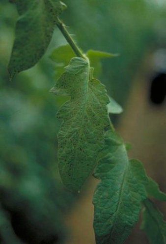 細菌病であり、初め下葉が周縁部からしおれ、乾燥して次第に巻き上がる。ついで葉脈間が黄変し、ついには枯死する。病勢が進展すると茎、葉柄、葉に隆起したコルク状の小斑点を生じる。果実にも白い鳥眼状の斑点が現れることがある。種子伝染、土壌伝染する。摘芽、摘芯による二次伝染も多い。