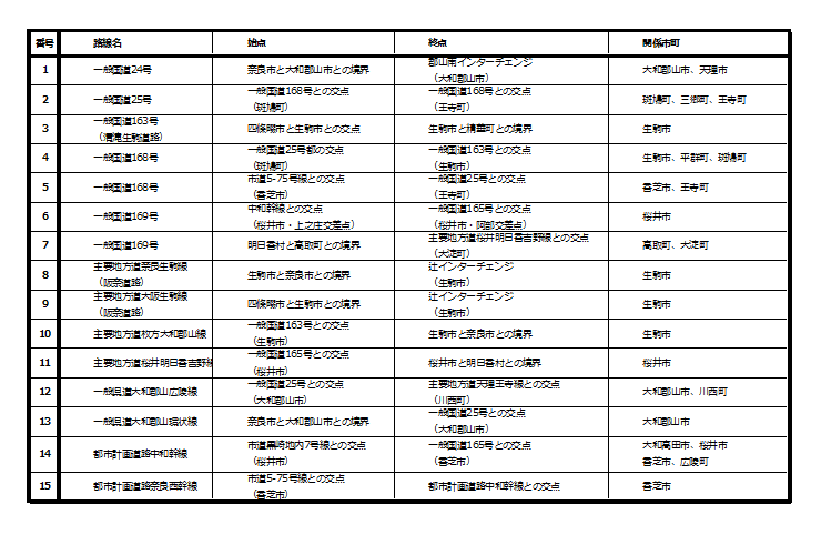 奈良県景観計画に定める広域幹線沿道区域等(全15路線)に指定された下記路線における、信号を有する交差点の周辺30mの地域