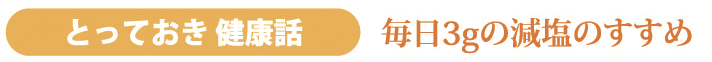 最近、国立循環器病研究センターが提案した「減塩食レシピ」が本になりヒットするなど、「減塩」が注目されています。塩分の多い食べ物の摂りすぎは高血圧につながり、心臓病や脳卒中などの発症率を高めます。塩分摂取量の一日の目安量は、男性で9g未満、女性で7.5g未満とされていますが、県民の一日の平均は、男性が11.6g、女性が10.1g(H23)と目安量を3gほど上回っています。毎日の食事の塩分を計り「適量」以下にすることは理想的ですが、ここでは、よりわかりやすい目安「摂りすぎている3g」の減塩をおすすめします。