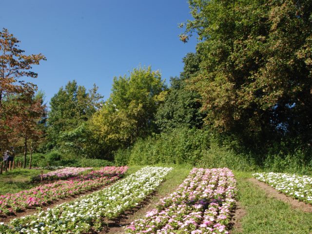 馬見花だより9月16日 園内ではフラワーフェスタ(10月3日~18日)に向けて、花の植え替えが進んでいます。写真の花はジニア・プロフュージョンです。 「花の道」でサルビア・アズレアが咲き始めました。北米原産の草丈の高くなる植物です。公園では少し倒れ気味に咲いています。 「彩りの広場」のダリア園前花壇です。赤紫の花はペチュニアです。後方のダリア園では、花が咲き始めました。 (彩りの広場近く/北エリア) (花の道/中央エリア) (彩りの広場/北エリア)