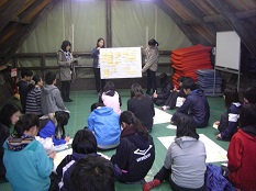 「森林の色探しと発表」では、21の色が示されたシートと地図、カメラを持ち、センターの中を班で回りました。普段は何気なく見過ごしてしまうような葉っぱや木もよく見ると、紫色や黄色、赤色をしていて、新たな発見がありました。それぞれの班が見付けた色でテーマを決め、物語を作って発表をしました。それぞれの班の個性が出て、見ている側も楽しむことができました。