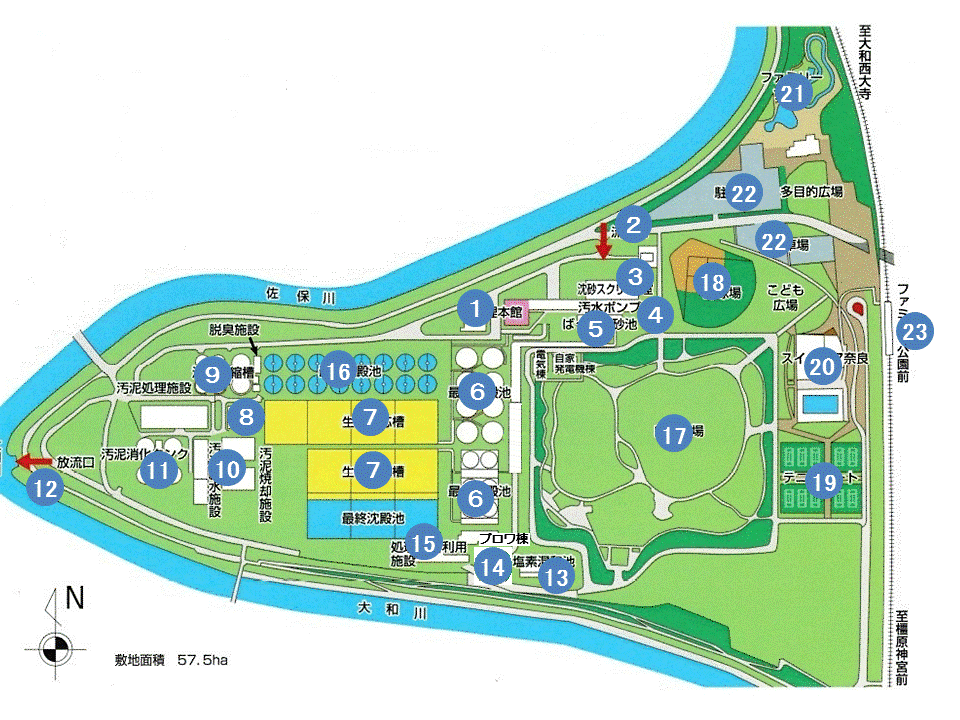 管理本館 流入口 沈砂スクリーン室 汚水ポンプ室 ばっ気沈砂池 最初沈殿池 脱臭施設 汚泥濃縮槽 汚泥処理施設 汚泥消化タンク 放流口 塩素混和池 ブロワ棟 処理水再利用施設 最終沈殿池 自由広場 野球場 テニスコート スイムピア奈良 ファミリープール 駐車場 ファミリー公園前駅