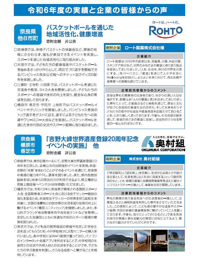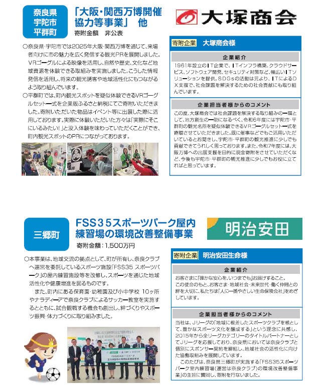 令和3年度 奈良県 【ランニングイベント開催事業】 ・株式会社奥村組 【新型コロナウイルス感染症対策医療体制整備事業】 ・一般社団法人 関西ゴルフ連盟 ・明治安田生命保険相互会社 ・JESCOホールディングス株式会社 ・JESCO株式会社 奈良市 【子どもセンター周辺一体整備事業】 ・明治安田生命保険相互会社 ・株式会社JECC ・株式会社デイケイケイサービス関西 ・株式会社松本コンサルタント ・株式会社淺沼組 ・株式会社宮本工業所 ・株式会社五輪 ・有限会社ケーウィンズ 大和郡山市 【大和郡山まちづくりリノベーション事業】 ・信金中央金庫 【郡山城跡公園整備事業】 ・株式会社中西製作所 ・株式会社淺沼組 ・株式会社ウォーターエージェンシー 天理市 【天理ならではの魅力を活かし、新しい人の流れをつくる事業】 ・平井建設株式会社 ・ロート製薬株式会社 橿原市 【文化財との新しい関わりを提案 未来へつなぐマイ文化財プロジェクト】 ・第一生命保険株式会社 ・株式会社アースダンボール ・奈良中央信用金庫 ・株式会社 アミパラ 桜井市 【纒向遺跡及び市内文化財の先端技術等を用いた魅力発信プロジェクト】 ・株式会社NIPPO ・大日本土木株式会社 【サイクルツーリズム受入環境整備事業】 ・サンワクレーン株式会社 ・株式会社ハクリュウ ・株式会社中作 ・鳳隆建設株式会社 【大神神社参道周辺地区まちづくりプロジェクト】 ・A-LIFE株式会社 ・株式会社淺沼組 ・株式会社アスカデンタルサプライ ・株式会社モリタ 生駒市 【地域未来人財育成事業】 ・株式会社ライフケア創合研究所 香芝市 【市内4中学校バレーボール部を応援事業】 ・株式会社奥村組 【学校教育環境整備事業】 ・A-LIFE株式会社 【福祉・健康部局の相談窓口カウンターリニューアル事業】 ・奈良ヤクルト販売株式会社 葛城市 【DX推進員報酬等(人材派遣型)、危険空き家解体補助金、子ども医療費扶助、葛城市相撲館工事請負費】 ・リコージャパン株式会社 宇陀市 【活力あるまちづくり事業】 ・株式会社中尾組 ・株式会社中和ホールディングス ・ロート製薬株式会社 平群町 【特産品・平群ブランド開発事業】 ・株式会社 創和 三郷町 【令和3年度 奈良学園大学跡地活用設計業務(10号館詳細設計等)】 ・ロート製薬株式会社 田原本町 【コミュニティFMラジオ事業】 ・信金中央金庫 明日香村 【世界遺産登録推進プロジェクト】 ・株式会社長谷工コーポレーション 王寺町 【明神山スカイデッキ新築プロジェクト】 ・ニチアス株式会社 【文化財による王寺町のまちづくり事業】 ・A-LIFE株式会社 吉野町 【愛・学習机プロジェクト】 ・株式会社 森下組 十津川村 【釈迦ヶ岳公衆トイレ改修事業】 ・アート産業株式会社 川上村 【川上村まち・ひと・しごと創生推進計画】 ・医療法人 藤井会 ・株式会社 イムラ ・株式会社 Kカンパニー ・川上村森林組合 ・松本林業 株式会社 ・株式会社 KINOSHITA建設 ・株式会社 櫻井