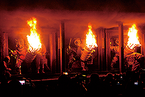 | 500年の伝統をほこる火の祭典「鬼走り」が行われます。燃えさかる松明を持った鬼が堂内を豪快に巡り、住民の災厄を払います。鬼が幸いをもたらす行事は珍しく、国の重要無形民俗文化財にも指定されています。無料。臨時駐車場有。 |