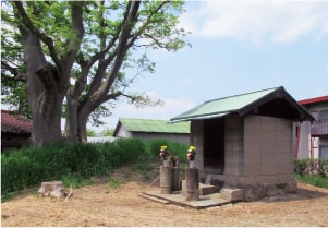 東安堵の六斎念仏では鉦(かね)を打ちながら念仏を唱えて先祖を供養します。お盆の8月13日は、極楽寺で念仏を唱え、郷墓(ごうばか)で「七墓参り」を行います。14日は、大寶寺(だいほうじ)で法衣を着て念仏を唱えた後、100軒以上の檀家を約10人の講員が2班に分かれて巡ります。各檀家にて念仏を唱えた後は、「タカ塚」の祠(ほこら)前でも念仏を唱和します。15日には大寶寺で阿弥陀三尊来迎図(らいごうず)にお供えをし、念仏を唱えます。お盆以外でも、農繁期を除いて年に10回、大寶寺で念仏を唱和しています。