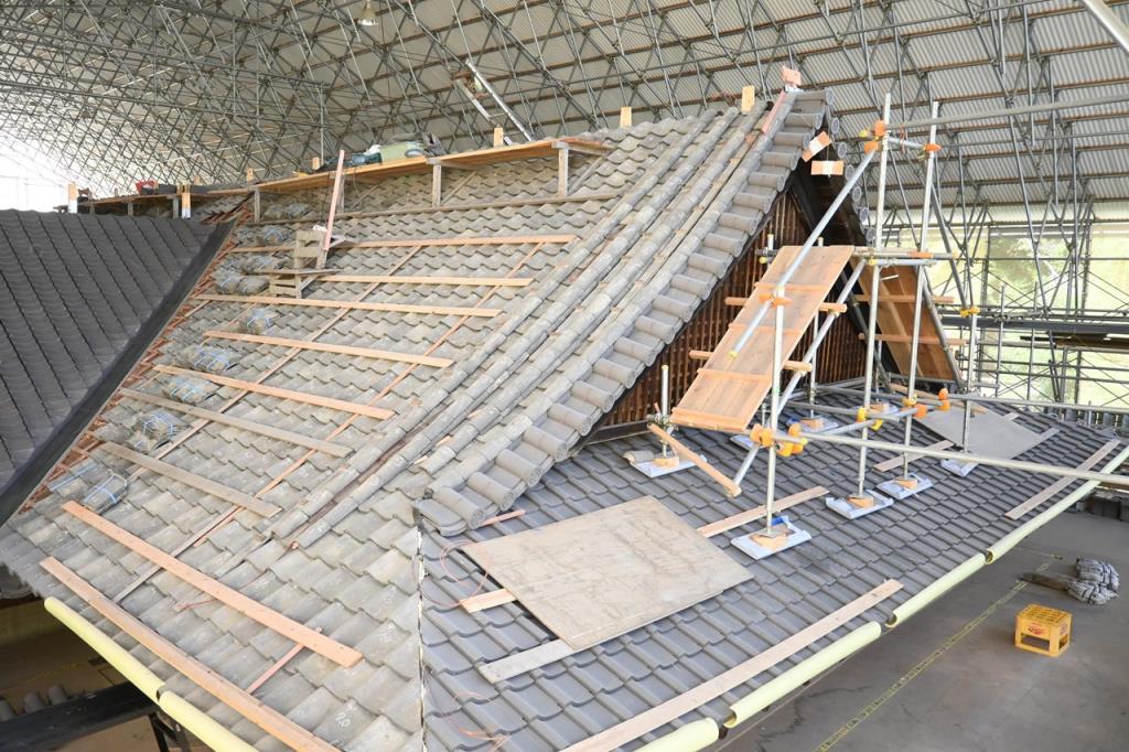瓦を葺く前に屋根全面に透湿防水シートを敷設し、その上に杉皮による土居葺(※昔の防水シート)を行いました。勾配が緩やかな部分については、透湿防水シートの上にさらに瓦棒銅板葺を施工しています。修理前は葺土の上に瓦をのせていましたが、今回は地震対策で屋根の重さを軽くする必要があったため、葺土を用いず瓦を木桟に固定する空葺工法によって瓦を葺きました。施工現寸図を参考にしながら、仮合わせで決定した組み合わせをもとに、屋根の中央から隅に向かって瓦を葺き上げ、最後に棟積みを行うことで屋根瓦葺工事は完了しました。