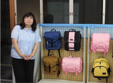 小学生の通学用カバン「Dランド」は軽さ、耐久性、耐水性だけではなく使い心地にもこだわった弊社を代表する商品です。実際に小学生に使ってもらいながら、行政や大学などの研究機関と連携し、何度も改良を重ねました。障害のある子どもにも使いやすいデザインにしたことで、「軽くて使いやすい。すごく楽です。」など、たくさんの喜びの声を頂いています。