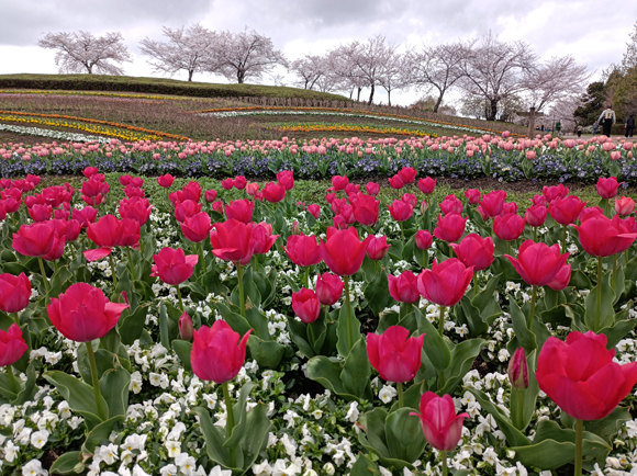 「馬見花苑」の花壇は、パンジーやビオラにチューリップ(早生品種)の彩りが加わり華やかです。写真後方のサクラも見頃間近です。【馬見花苑/北エリア】