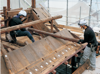 「桔木(はねぎ)」という屋根の軒先を支える部材を解体している様子