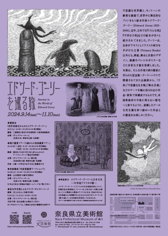 本展は、昨年度から渋谷区立松涛美術館を皮切りに始まった日本全国巡回展であり、関西初開催になります。また、当館オリジナルで、関連展示「エドワード・ゴーリーと日本文化-20世紀アメリカの眼-」を同時開催いたします。