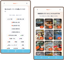 年齢、興味・関心のあるキーワード、日付、移動手段などを選択することで、AIが観光スポットやイベント、飲食店などを提案(リコメンド)します。