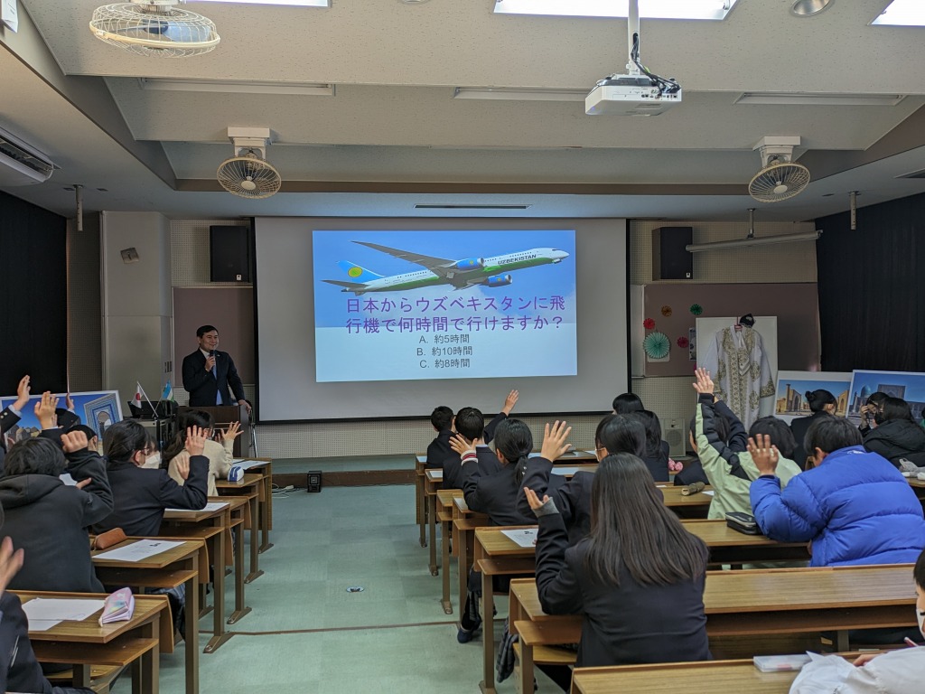 令和6(2024)年2月、県立国際中学校で駐日ウズベキスタン共和国大使館二等書記官エルガシェフ・ファヒリデイン氏による出張授業「シルクロードの宝石・ウズベキスタンを知ろう!」を開催しました。
