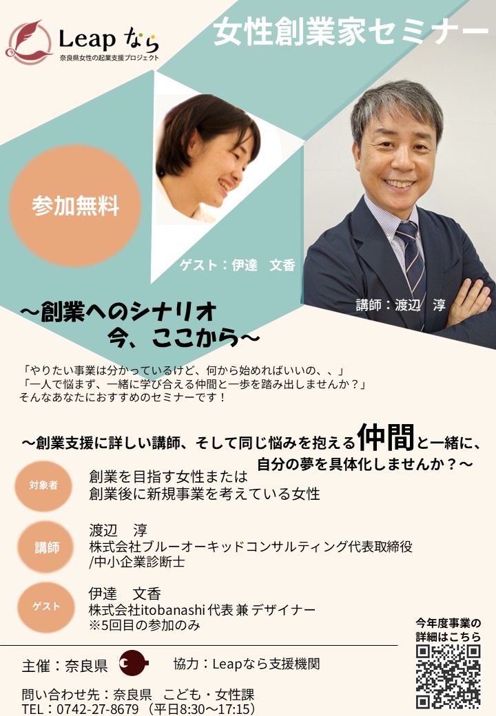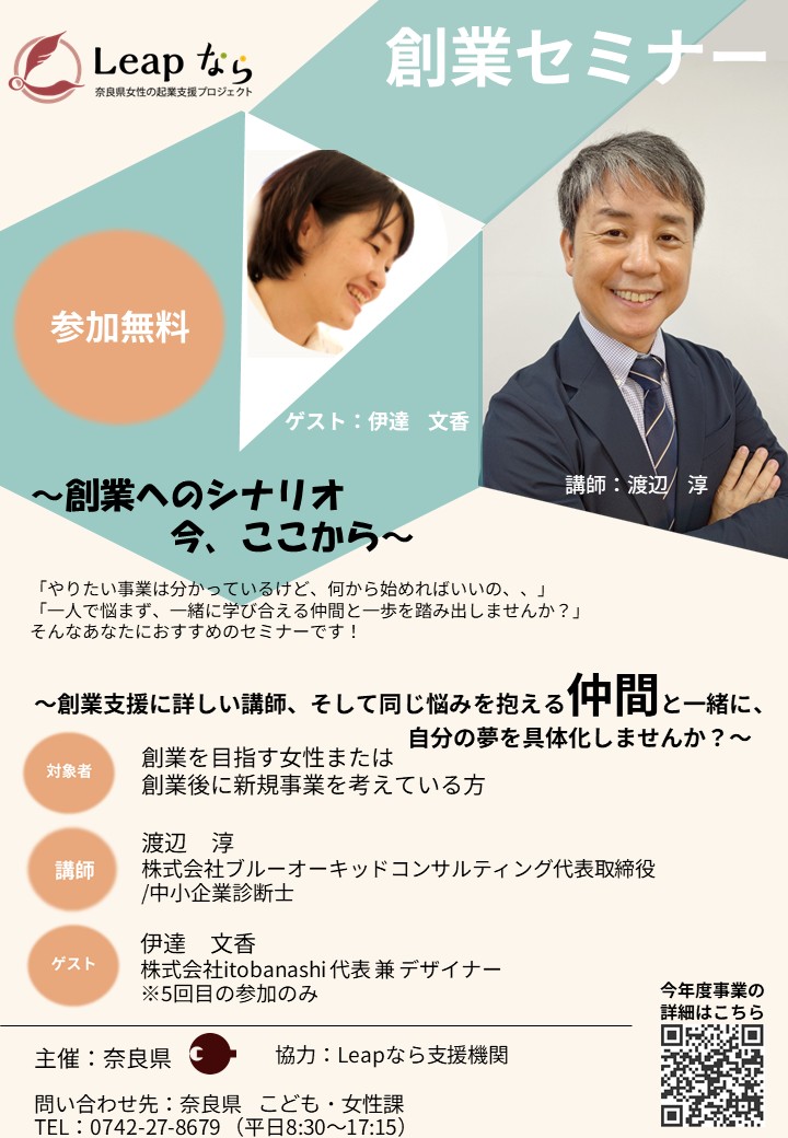 ※定員に達した場合、これまで奈良県こども・女性課主催の創業セミナーの参加経験がない方を優先させていただく場合がございます。何卒ご了承ください。