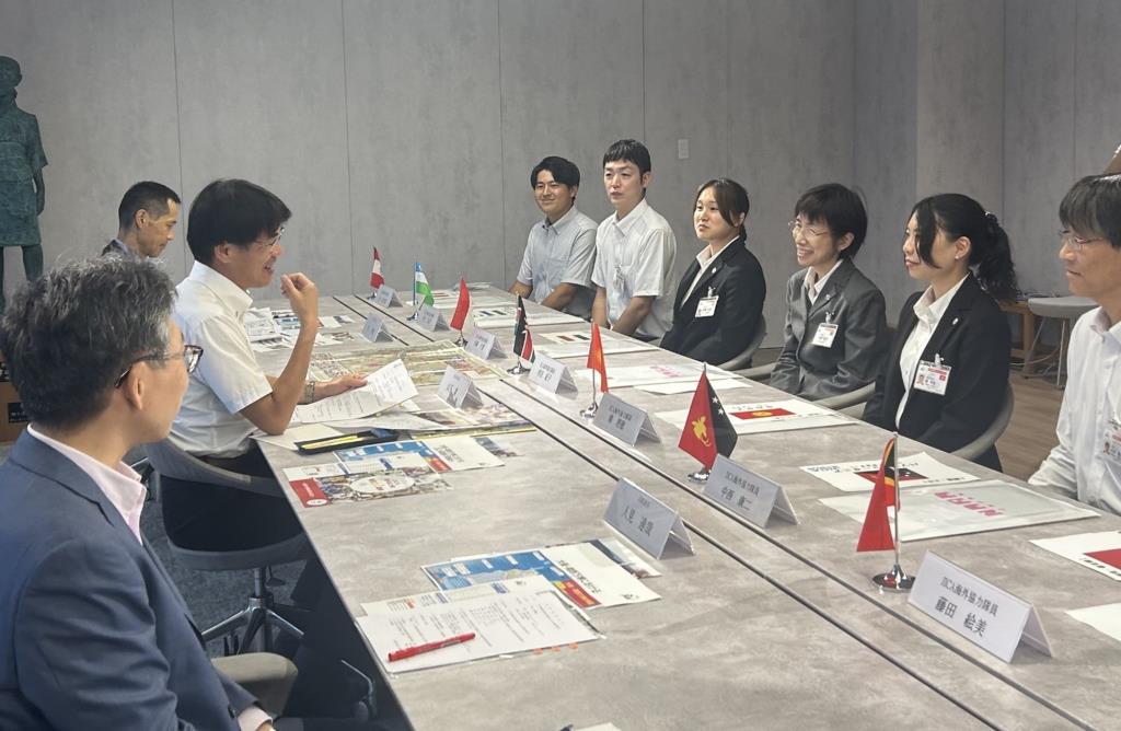 2025年7月14日、この夏出発予定のJICA海外協力隊員6名(村田さん、椿さん、舟﨑さん、中西さん、中辻さん、藤田さん)と今年4月に帰国した隊員1名(八木さん)が山下知事を表敬訪問されました。知事からは励ましと期待の言葉があるなど、なごやかな雰囲気の中、意見交換が行われました。
