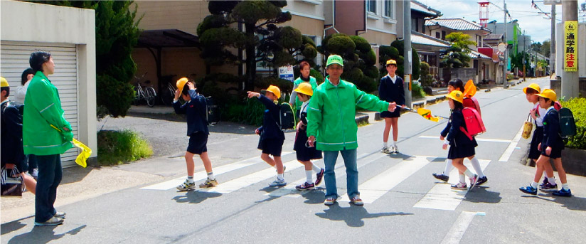 ▲生駒市桜ヶ丘小南ゾーンでの「ゾーン30」の表示状況。 ▲「川西町見守り隊」による見守り活動。 自治会間でも連携を図り、登下校時の子どもたちの引率などを行います。