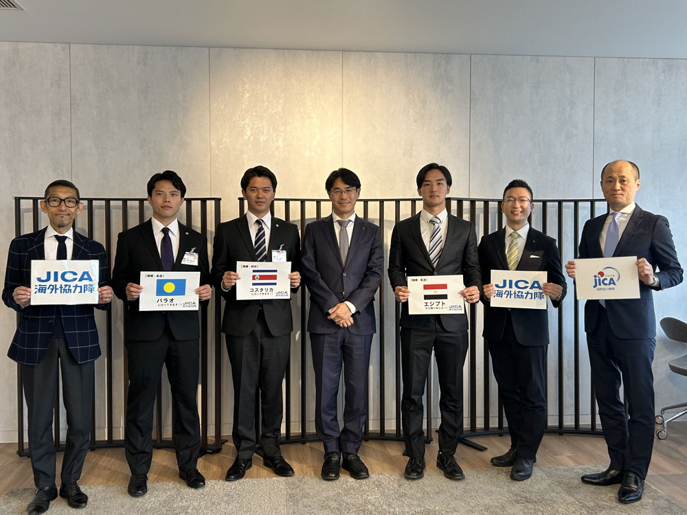 今月出発予定のJICA青年海外協力隊員2名(池田さん、田畑さん)と今年10月に帰国した隊員1名(門田さん)が山下知事を表敬訪問されました。