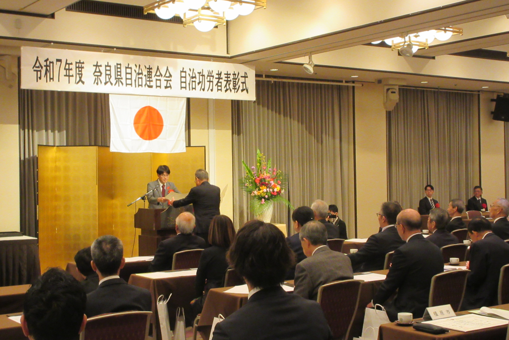 2025年10月28日 令和7年度奈良県自治連合会自治功労者表彰式 令和7年度奈良県自治連合会自治功労者表彰式が開催されました。この表彰は、永年にわたり自治会長等として地域活動に貢献された方々を表彰するもので、今年度は、知事表彰・会長表彰合わせて53名の方が受賞され、山下知事、県自治連合会会長より表彰状が授与されました。 2025年10月28日