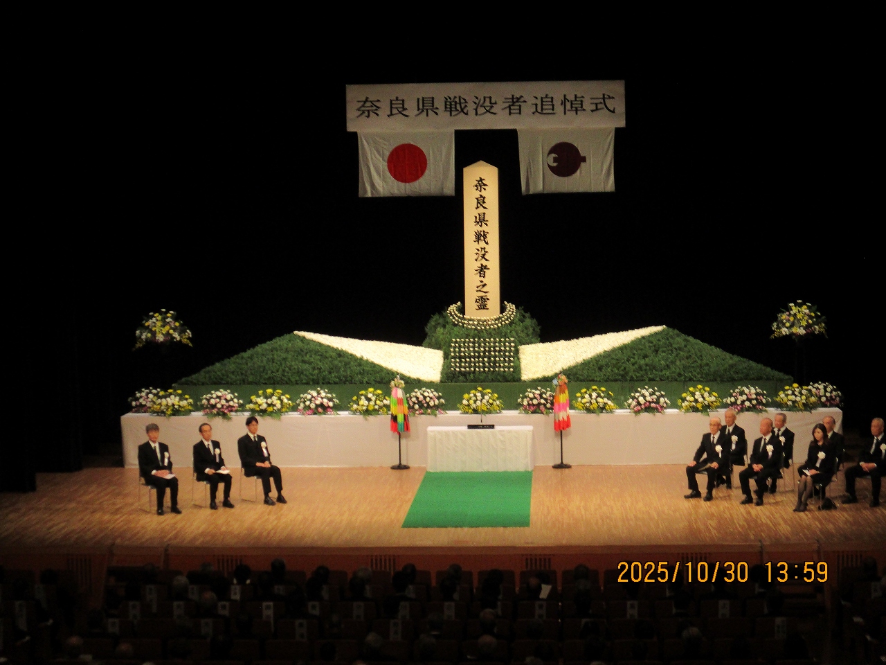2025年10月30日 奈良県戦没者追悼式 DMG MORI やまと郡山城ホールにおいて奈良県戦没者追悼式を挙行し、県出身戦没者に謹んで哀悼の意を表しました。 また、追悼式の後、永年にわたり戦没者遺家族の福祉の向上に尽力された方々を表彰しました。 2025年10月30日