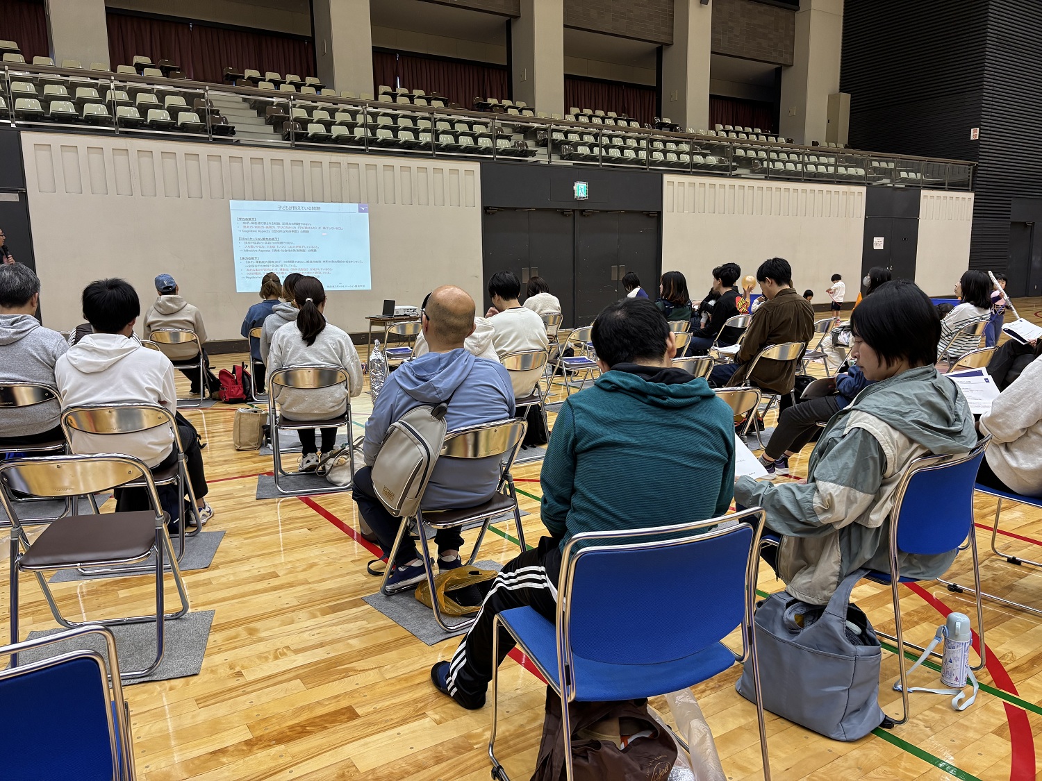 こどもたちに体を動かす楽しさを知っていただくため、親子で実践いただく「親子de運動あそび」を行い、その後、こどもたちには家にある新聞紙や袋、風船などを使用した「自由遊び」を、保護者には、こどもの頃からの運動習慣の重要性を知っていただくため「運動講習会」を実施し、41組95名の方にご参加いただきました。