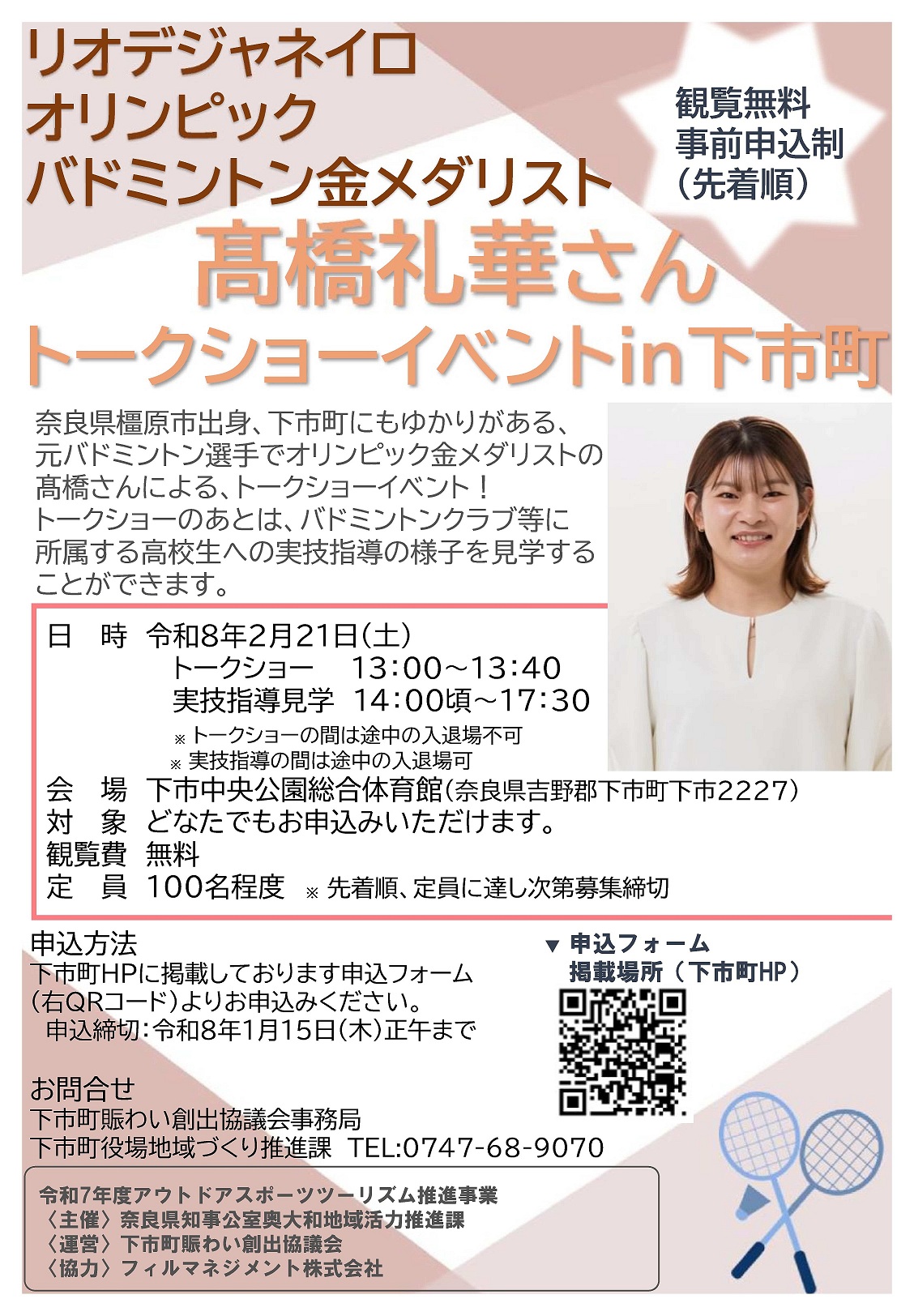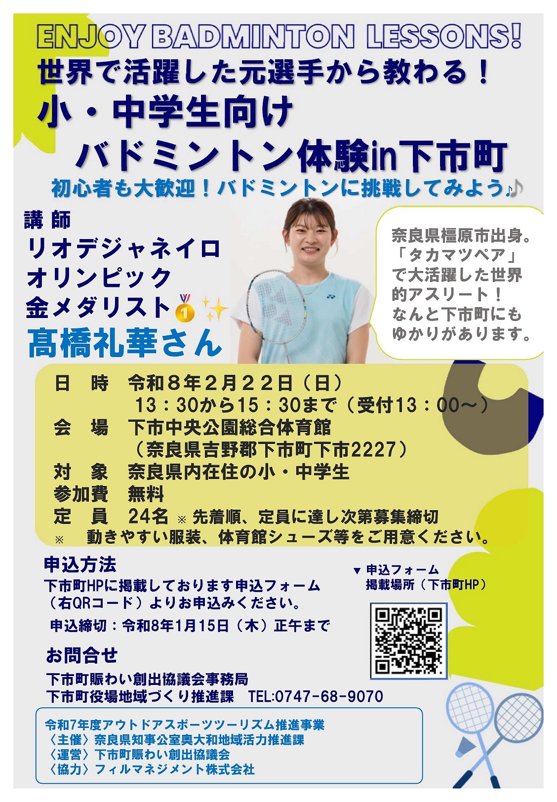 奥大和地域のスポーツ合宿地としての認知度向上を図るとともに、スポーツを通じた地域の活性化を推進することを目的に、奈良県橿原市出身で下市町にもゆかりがあるバドミントン金メダリスト・髙橋礼華さんを講師に迎え、高校生向け強化クリニック及び小・中学生向けバドミントン体験教室を開催します。