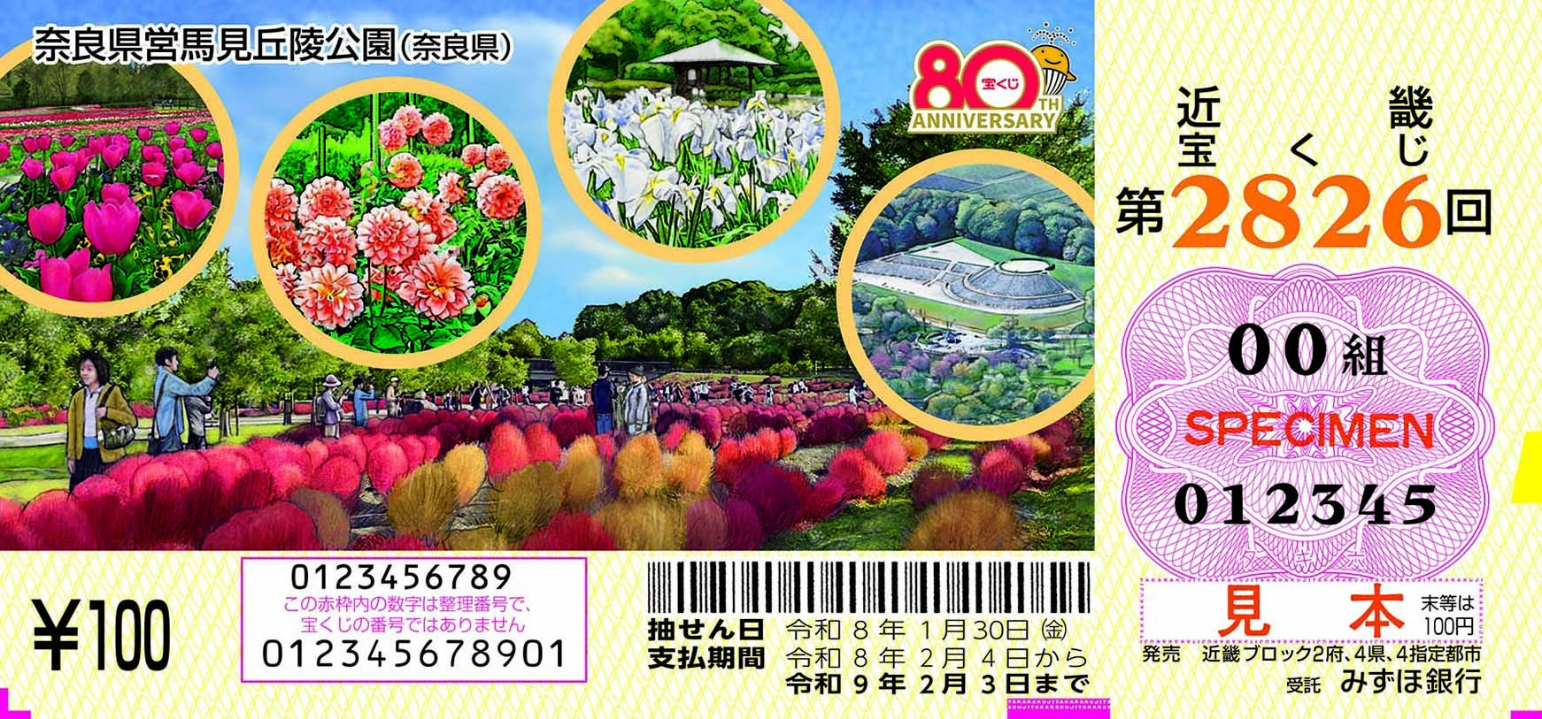 「奈良県営馬見丘陵公園」が宝くじの図柄に <<1月7日(水)から1月27日(火)まで>> 「奈良県営馬見丘陵公園」が図柄になった、近畿宝くじ(第2826回)が発売されます! ※報道資料(pdf 108KB) 添付資料(pdf 166KB) ご購入頂いた宝くじの収益金は、県内の道路・公園整備をはじめ、様々な公共事業や文化芸術活動など、 県民の皆さまの身近なところで役立っています。 近畿宝くじをお求めの際は、ぜひ奈良県内の宝くじ売り場もしくはインターネットでご購入ください。