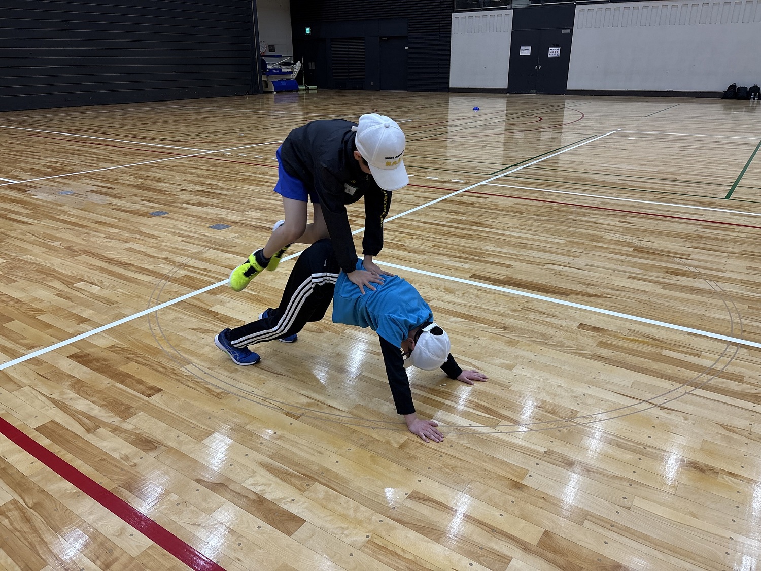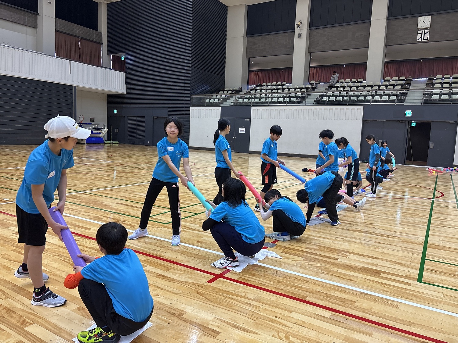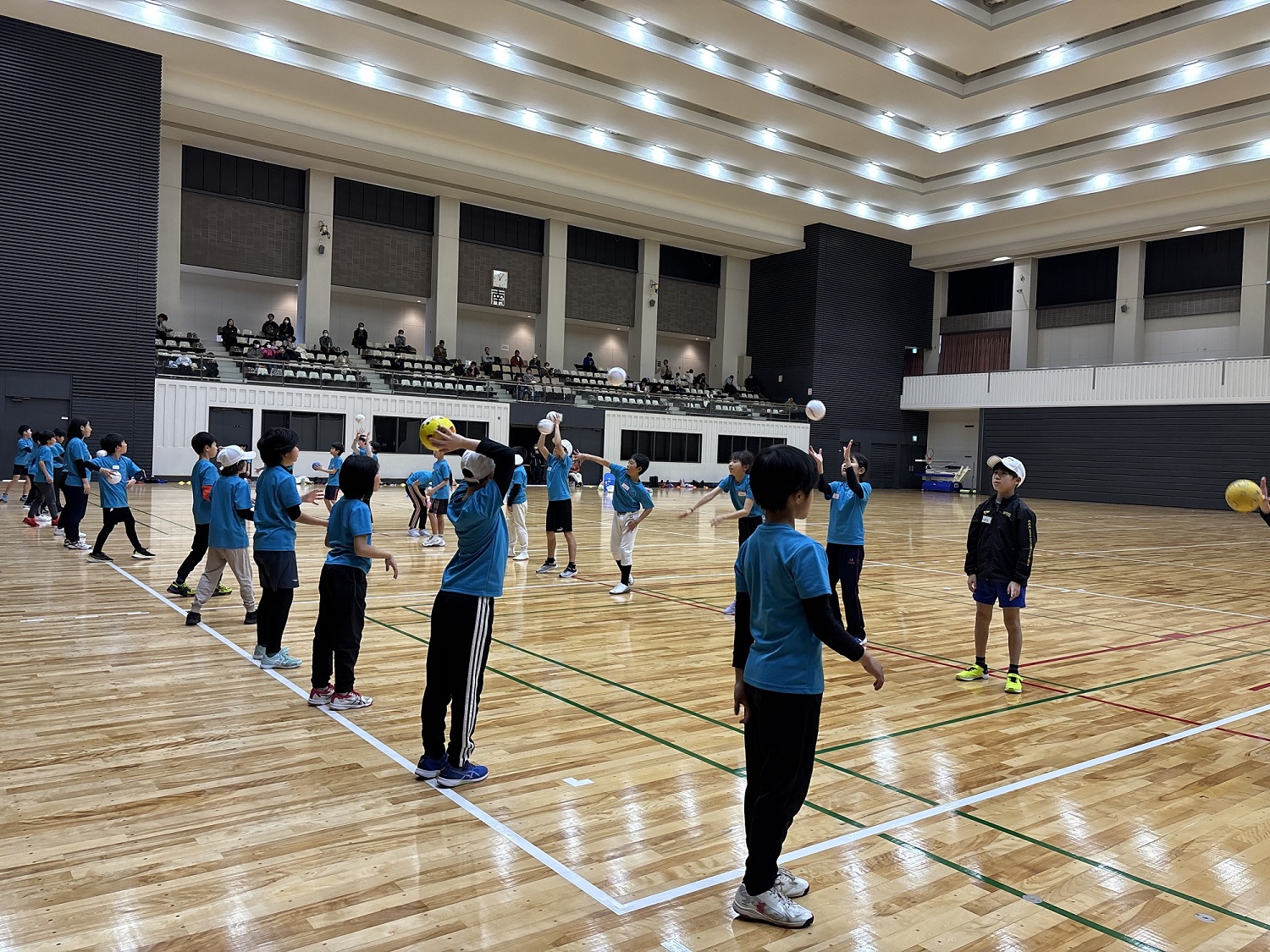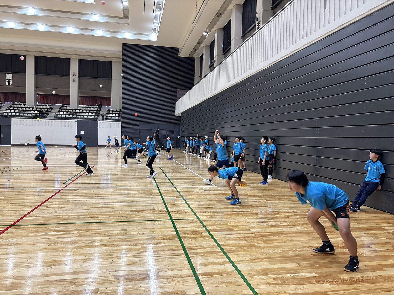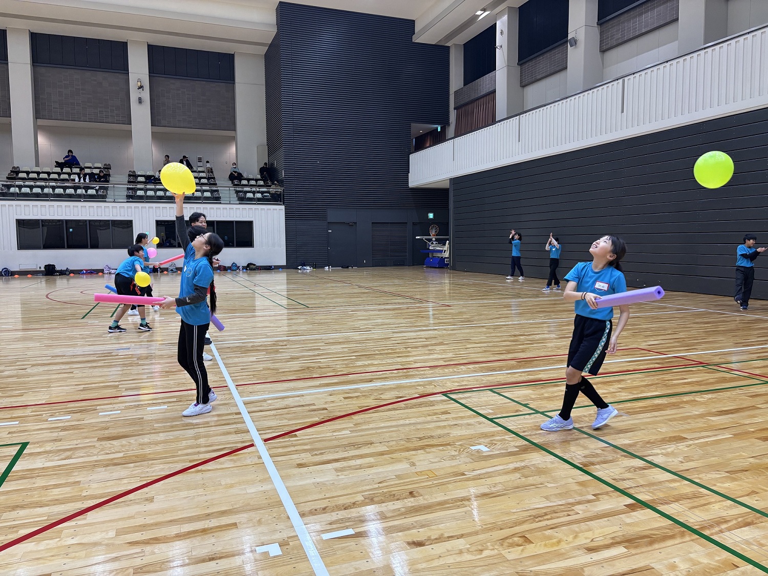 今回は、実技トレーニングを実施し、「倒す・押す・振る」をテーマにどのようにすればボールを遠く投げられるか、相手の力に負けずに最大のパワーを発揮できるか、ポールと風船を使ってペアの子と長くラリー続けるかなどを学ぶトレーニングを行いました。