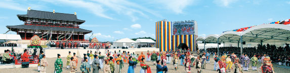 | 10月8日、第一次大極殿前庭において、平城遷都1300年記念祝典が盛大に執り行われました。 1月から始まった平城遷都1300年祭。記念祝典はその中心となる式典であり、天皇皇后両陛下をはじめ、国(国会・内閣・裁判所)の代表や、外国政府代表、東アジア地方政府会合参加の各地方政府代表など、国内外から約1700人が出席されました。 祝典は、天平衣装の文官・武官・女官による歓迎の舞で幕を開け、仲川げん奈良市長による開会宣言の後、元明天皇が当時発した「平城京遷都の詔(みことのり)」が読み上げられました。 歓迎挨拶として、荒井正吾奈良県知事が「1300年前、渡来人や遣唐使によって数々の文明の果実が日本にもたらされました。そんなグローバルな7、8世紀と同じように、今度は奈良県が東アジアの平和と繁栄のためにお返しをしたい」と述べました。 天皇陛下からは「平城京は私の父祖の地として深いゆかりを感じています。わが国の古くから伝わる文化を守り育ててきた奈良の人々の幸せを祈ります」と、おことばを賜りました。 その後、東アジアとの交流により誕生した平城京の歴史や文化をテーマにした楽劇(がくげき)「平城(なら)・アジア友好の架け橋」が演じられ、会場全体がまるで1300年前にタイムスリップしたかのようでした。 そして、これからの時代を担うアジア各国の子どもたちが、「平城遷都1300年の歴史の中で、嬉しいことも悲しいこともありました。私たちはその歴史をよくかみしめ、勇気と希望と展望をもって、新しい次の時代を皆さんと一緒につくっていくことを誓います!」と述べ、「私たちの平城遷都一三〇〇年宣言」として発信。歴史を踏まえた友好の未来を感じさせた記念祝典は閉会しました。 |