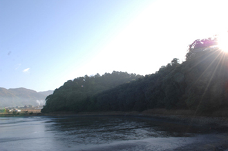 桜井駅から歩いて約20分、急に視界が開ける。三輪山をはじめ雄大な山々が連なり、目の前には初瀬川(大和川の上流域)が流れ、広い堤防が現れる。