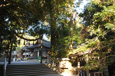 うす暗い山裾の道を進み、ゆるやかな坂道を登ると目の前から光が差し、眺望が開ける。神社の境内はキリッとした空気が流れ、自然と背筋が伸びる。