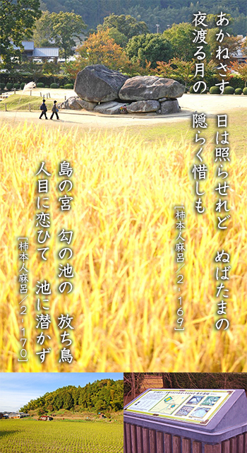 島の宮とは、草壁皇子が住んでいた宮のこと。そういえば、この付近には今も「島庄」という地名が残っている。この人麻呂の長歌は、草壁皇子が太陽神からの系統であることを示そうとしたもの。草壁皇子には、その死を悼んで詠まれた挽歌が数多く残っている。