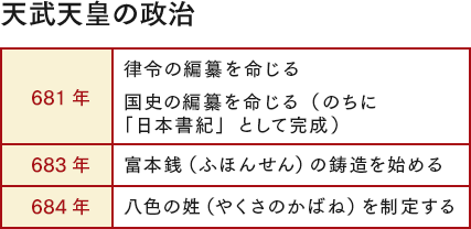 天武天皇は、皇族や皇親が主導する政治体制の確立に努め、律令の制定に着手し、国史の編纂を命じるなど、国の礎を築く政治を行いました。